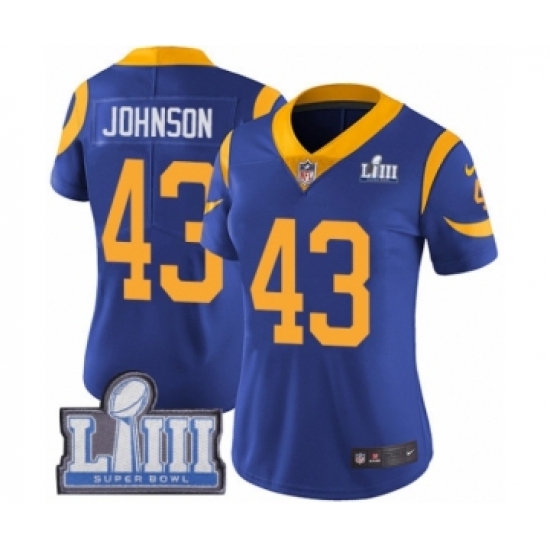 >Women's Nike Los Angeles Rams #43 John Johnson Royal Blue Alternate Vapor Untouchable Limited Player Super Bowl LIII Bound NFL Jersey