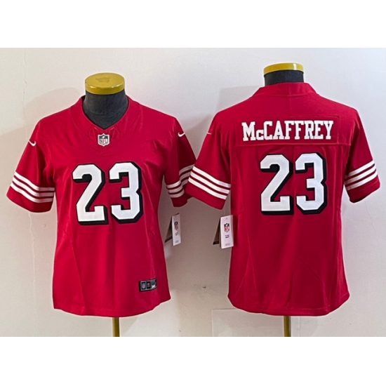 >Women's San Francisco 49ers #23 Christian McCaffrey New Red 2023 F.U.S.E. Vapor Untouchable Football Stitched Jersey