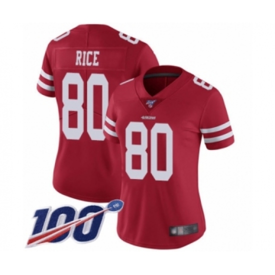 Women's San Francisco 49ers #80 Jerry Rice Red Team Color Vapor Untouchable Limited Player 100th Season Football Jersey