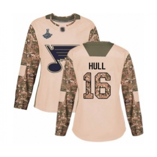 >Women's St. Louis Blues #16 Brett Hull Authentic Camo Veterans Day Practice 2019 Stanley Cup Champions Hockey Jersey