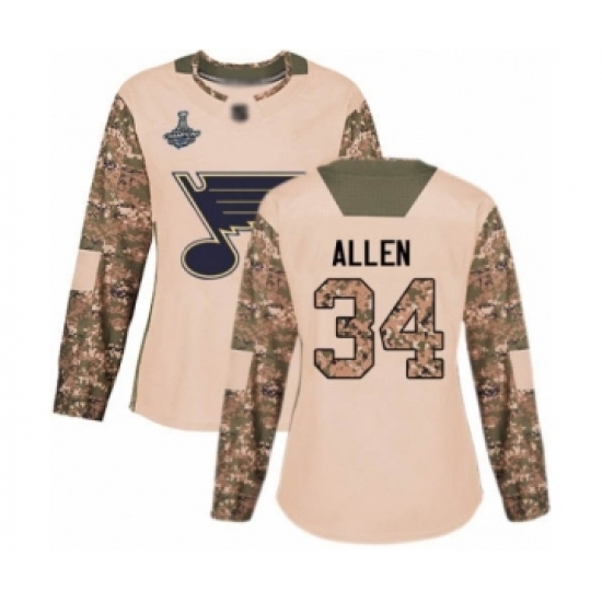 Women's St. Louis Blues #34 Jake Allen Authentic Camo Veterans Day Practice 2019 Stanley Cup Champions Hockey Jersey