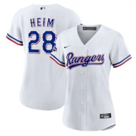 >Women's Texas Rangers #28 Jonah Heim Nike White Home 2023 World Series Champions Replica Player Jersey