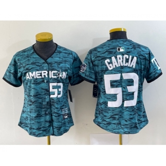 >Women's Texas Rangers #53 Adolis Garcia Number Teal 2023 All Star Stitched Baseball Jersey