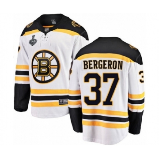 >Youth Boston Bruins #37 Patrice Bergeron Authentic White Away Fanatics Branded Breakaway 2019 Stanley Cup Final Bound Hockey Jersey