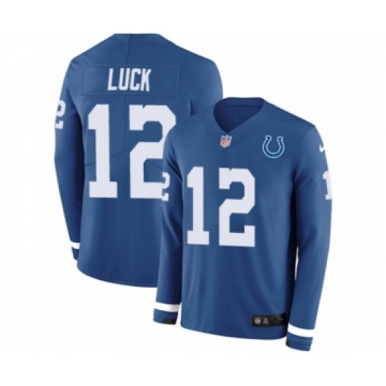 >Youth Nike Indianapolis Colts #12 Andrew Luck Limited Blue Therma Long Sleeve NFL Jersey