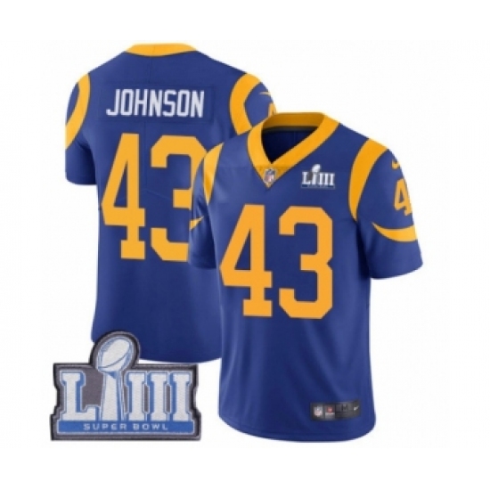 >Youth Nike Los Angeles Rams #43 John Johnson Royal Blue Alternate Vapor Untouchable Limited Player Super Bowl LIII Bound NFL Jersey