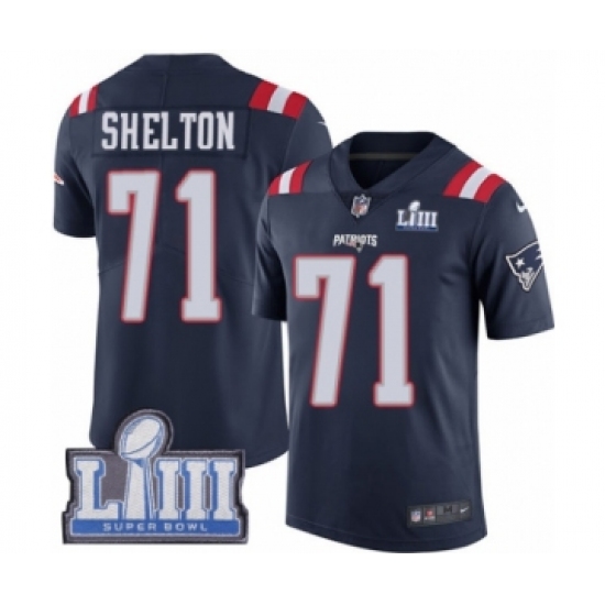>Youth Nike New England Patriots #71 Danny Shelton Limited Navy Blue Rush Vapor Untouchable Super Bowl LIII Bound NFL Jersey