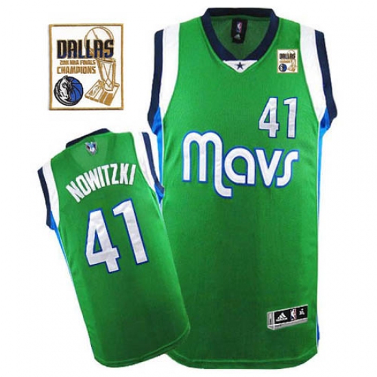 Home>NBA>Dallas Mavericks>Dirk Nowitzki>Men's Adidas Dallas Mavericks #41 Dirk Nowitzki Authentic Green Champions Patch NBA Jersey
