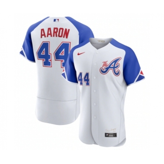 >Men's Atlanta Braves #44 Hank Aaron White 2023 City Connect Flex Base Stitched Jersey