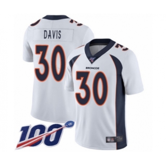 >Men's Denver Broncos #30 Terrell Davis White Vapor Untouchable Limited Player 100th Season Football Jersey