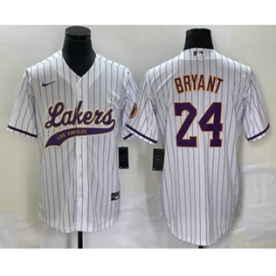 Men's Los Angeles Lakers #24 Kobe Bryant White Pinstripe Cool Base Stitched Baseball Jersey2