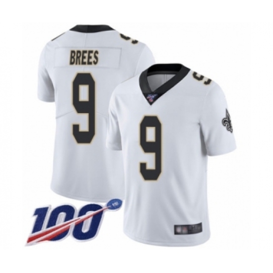 >Men's New Orleans Saints #9 Drew Brees White Vapor Untouchable Limited Player 100th Season Football Jersey