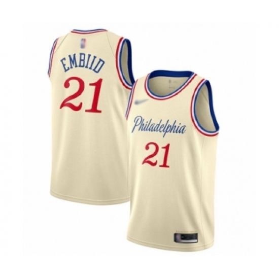 >Men's Philadelphia 76ers #21 Joel Embiid Swingman Cream Basketball Jersey - 2019 20 City Edition