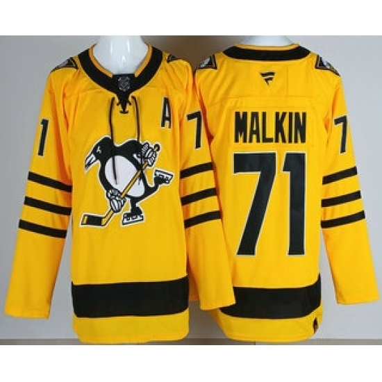 >Men's Pittsburgh Penguins #71 Evgeni Malkin Yellow Alternate Authentic Jersey