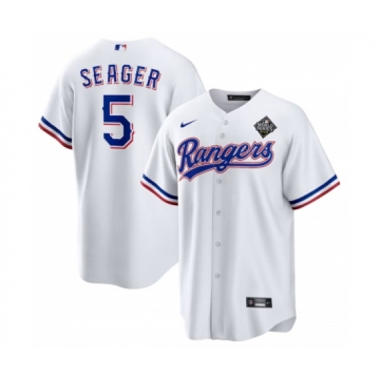 Men's Texas Rangers #5 Corey Seager White 2023 World Series Stitched Baseball Jersey