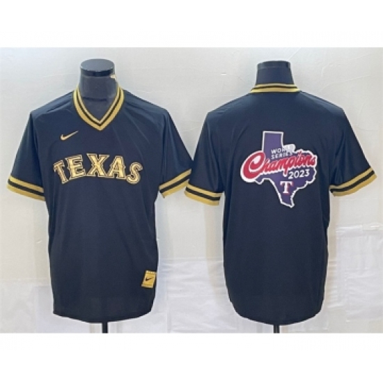 >Men's Texas Rangers Black 2023 World Series Champions Big Logo Cool Base Stitched Baseball Jerseys