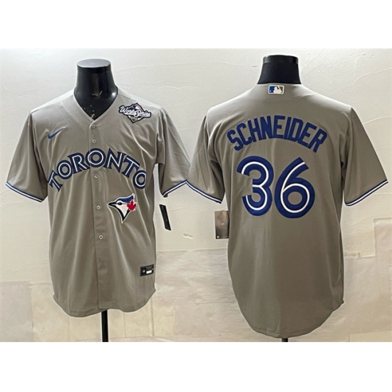 >Men's Toronto Blue Jays #36 Davis Schneider Gray 2025 World Series Cool Base Stitched Baseball Jersey