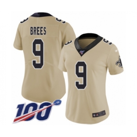 Women's New Orleans Saints #9 Drew Brees Limited Gold Inverted Legend 100th Season Football Jersey
